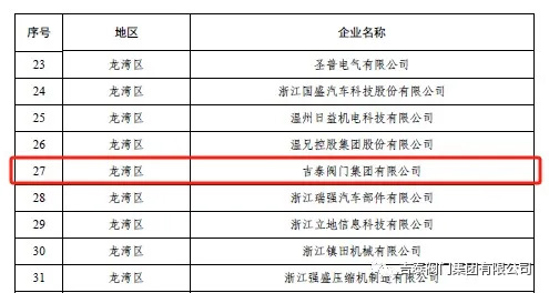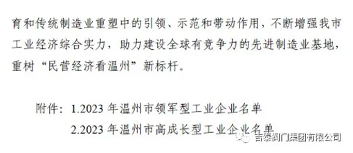 近日,溫州市政府對全市工業企業進行各項數據評比,公布2023年溫州市領軍型工業企業100家、高成長型工業企業195家名單,吉泰閥門集團榮獲23年溫州市高成長型工業企業。